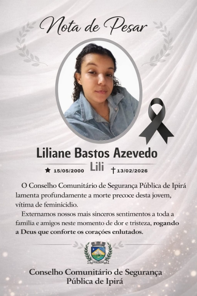 O Conselho Comunitário de Segurança (Conseg) de Ipirá manifestou profundo pesar pelo feminicídio da jovem Liliane Bastos Azevedo, registrado nesta sexta-feira,...